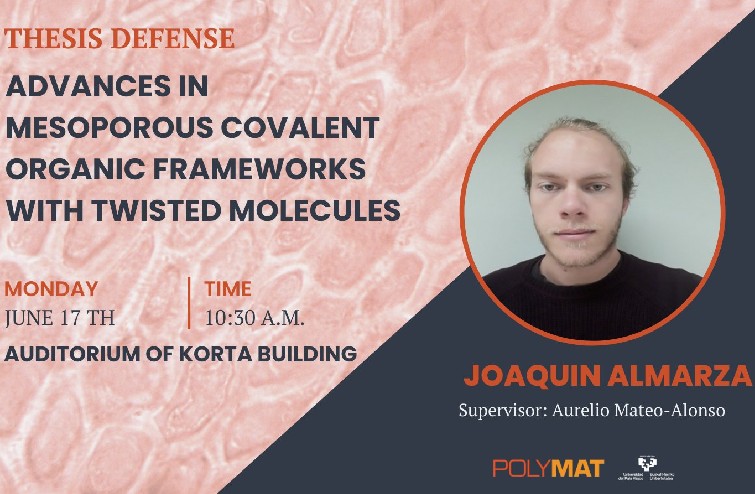 On June 17th Joaquin Almarza successfully defended his thesis entitled "Advances in mesoporous covalent organic frameworks with twisted molecules" supervised by Aurelio Mateo-Alonso.
