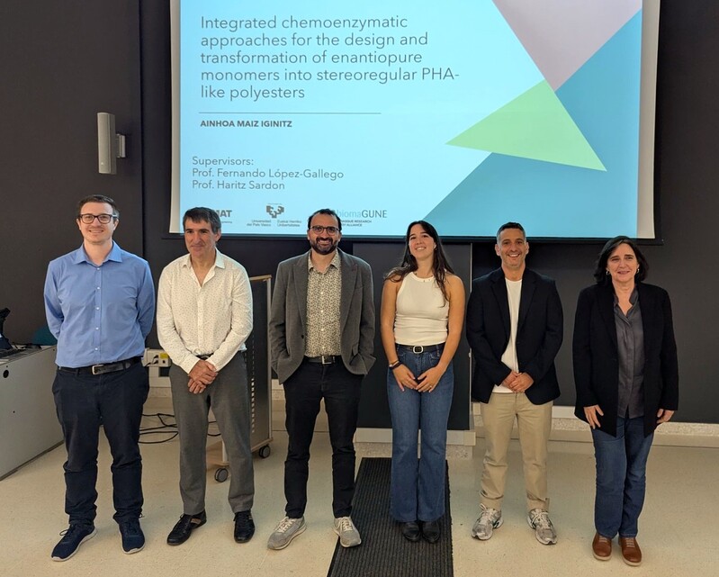 On October 31st, 2025, Ainhoa Maiz Iginitz successfully defended her PhD thesis, “Integrated chemoenzymatic approaches for the design and transformation of enantiopure monomers into stereoregular PHA-like polyesters,” at the Chemistry Faculty Auditorium.