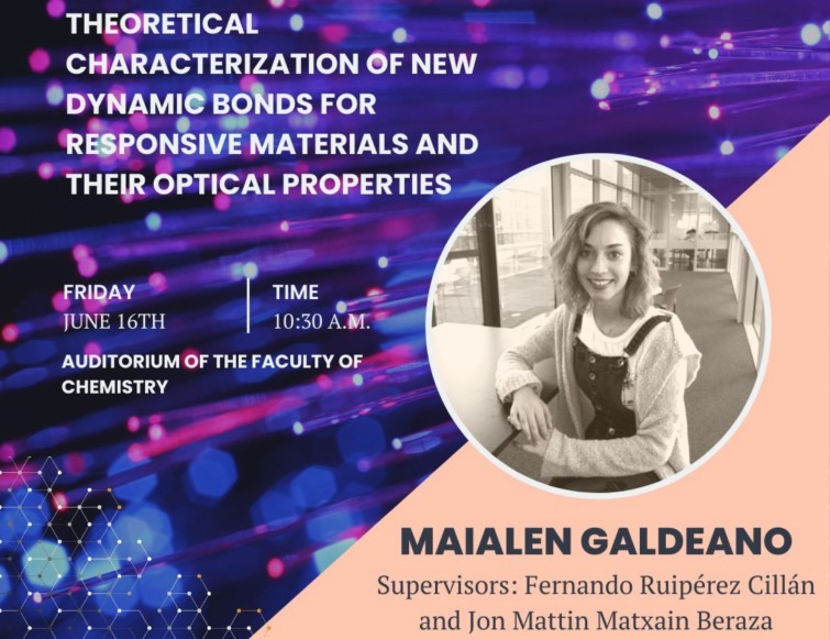 On June 16, Maialen Galdeano defended her thesis titled "Theorical charaterization of new dynamic bonds for responsive materials and their optical properties". Fernando Ruipérez from Polymat and Jon Mattin from DIPC supervised this doctoral thesis.