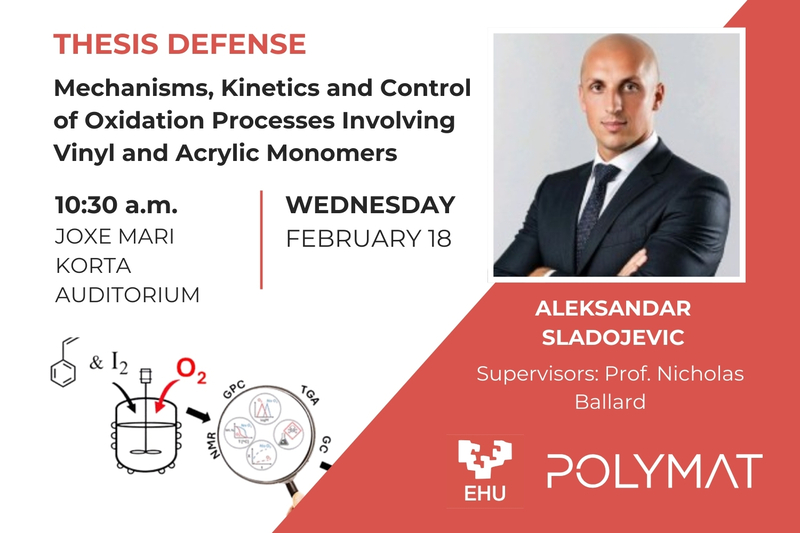 Mr. Aleksandar Sladojevic will defend his PhD thesis, “Mechanisms, Kinetics and Control of Oxidation Processes Involving Vinyl and Acrylic Monomers,” on February 18th at 10:30 a.m. in the Auditorium of the Joxe Mari Korta Building. Supervised by Prof. Nicholas Ballard, the research provides an in-depth study of oxidation mechanisms and kinetics in vinyl and acrylic monomers, contributing to improved understanding and control of processes relevant to polymer synthesis and materials performance. The thesis committee will be chaired by Prof. Werner Pauer (Universität Hamburg), with Prof. Radmila Tomovska (Euskal Herriko Unibertsitatea) as Secretary and Prof. Mattia Sponchioni (Politecnico di Milano) as Member.