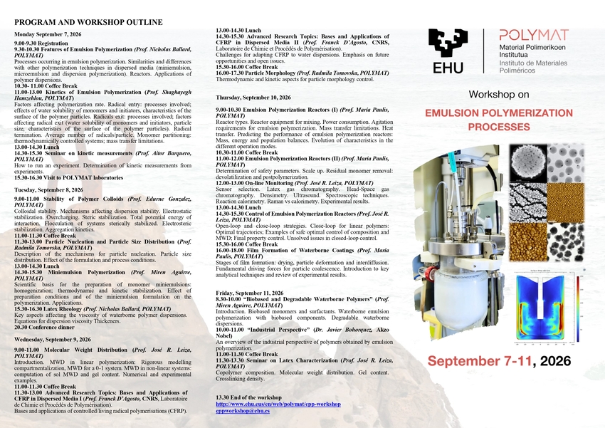 POLYMAT and the University of the Basque Country (EHU) are pleased to announce that registration is officially open for the upcoming Workshop on Emulsion Polymerization ProcessesThe five-day event will take place from September 7 to 11, 2026, at the Joxe Mari Korta Center, located on the EHU Campus in Donostia-San Sebastián, Spain.