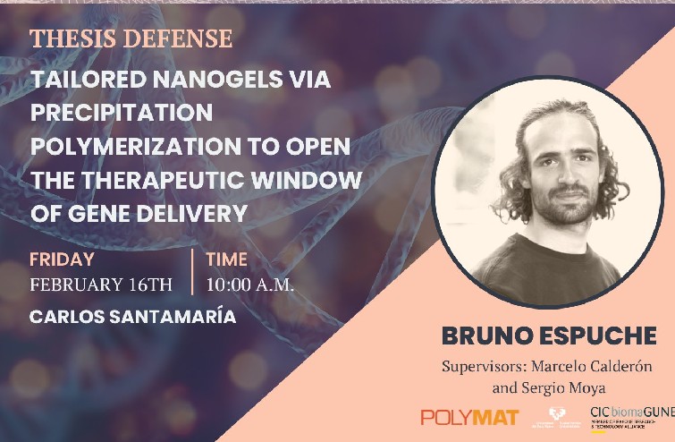 February 16th, Bruno Espuche defended his thesis titled "Tailored nanogels via precipitation polymerization to open the therapeutic window of gene delivery." The doctoral thesis was supervised by Marcelo Calderón from Polymat and Sergio Moya from CIC biomaGUNE.